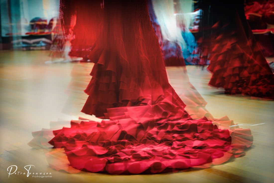 (Foto bovenaan: bata de cola (staartjurk) op de leerlingenshow Rosa Hermosa van flamencodanseres, choreografe en docente Selene Anneroza — ©Petra Teeuwsen)