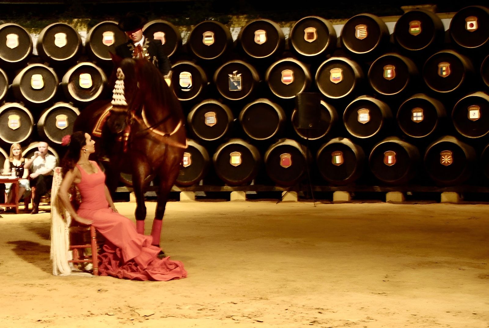 Don Álvaro Domecq ligt ons nauw aan het hart en we zijn er fier op dat we zijn sherry's mogen schenken. Elegantie en techniek, paarden en sherry: twee kunstvormen waarin de Andalusische traditie tot leven komt. En van daar is het maar een kleine stap naar die andere grote kunstvorm van Andalusië: flamenco. (Het gele zand hebben we hier voor alle gemak vervangen door zwevende eiken planken.)